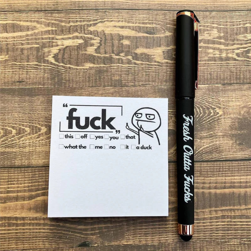 Is frustration taking over your day? Our Fresh Outta Fucks Pad and Pen is your ultimate stress relief companion. Get yours andembrace a new, calm you!