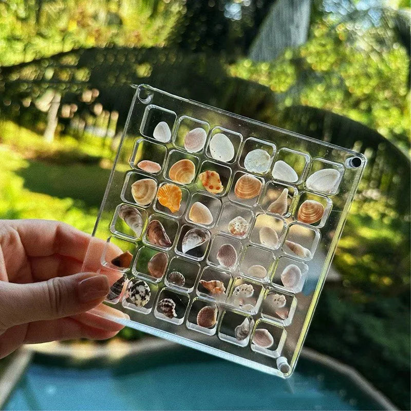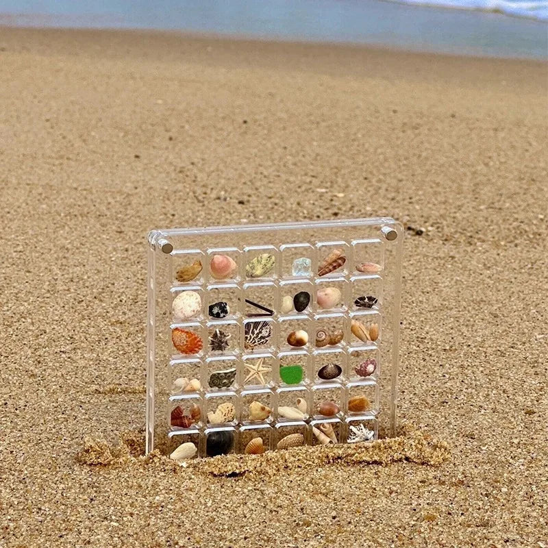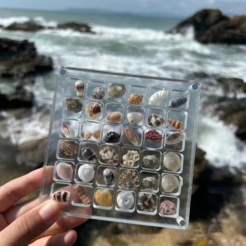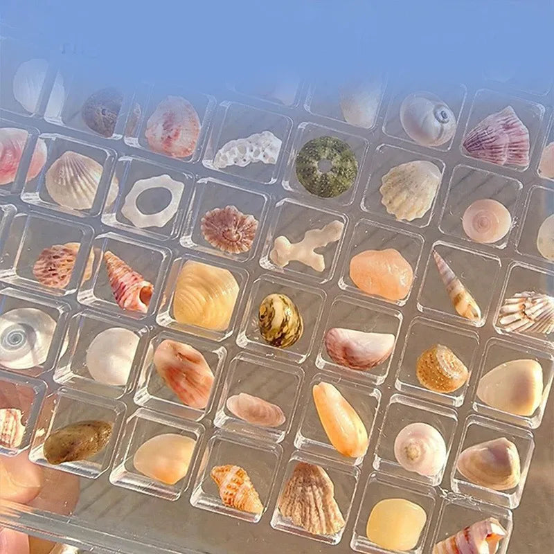 Our product is a crystal-clear case with 36 grids, perfect for housing your tiny seashells. The magnetic corners securely hold the lid in place, ensuring your collection stays safe and beautifully displayed.
